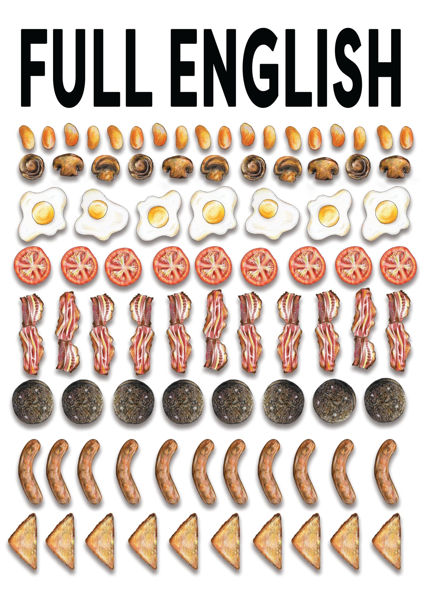 Start your day with a feast for the eyes! This hand-illustrated "Full English" breakfast print celebrates all the classic favourites – eggs, sausages, bacon, beans, mushrooms, tomatoes, black pudding and toast – all lovingly drawn with character and charm.